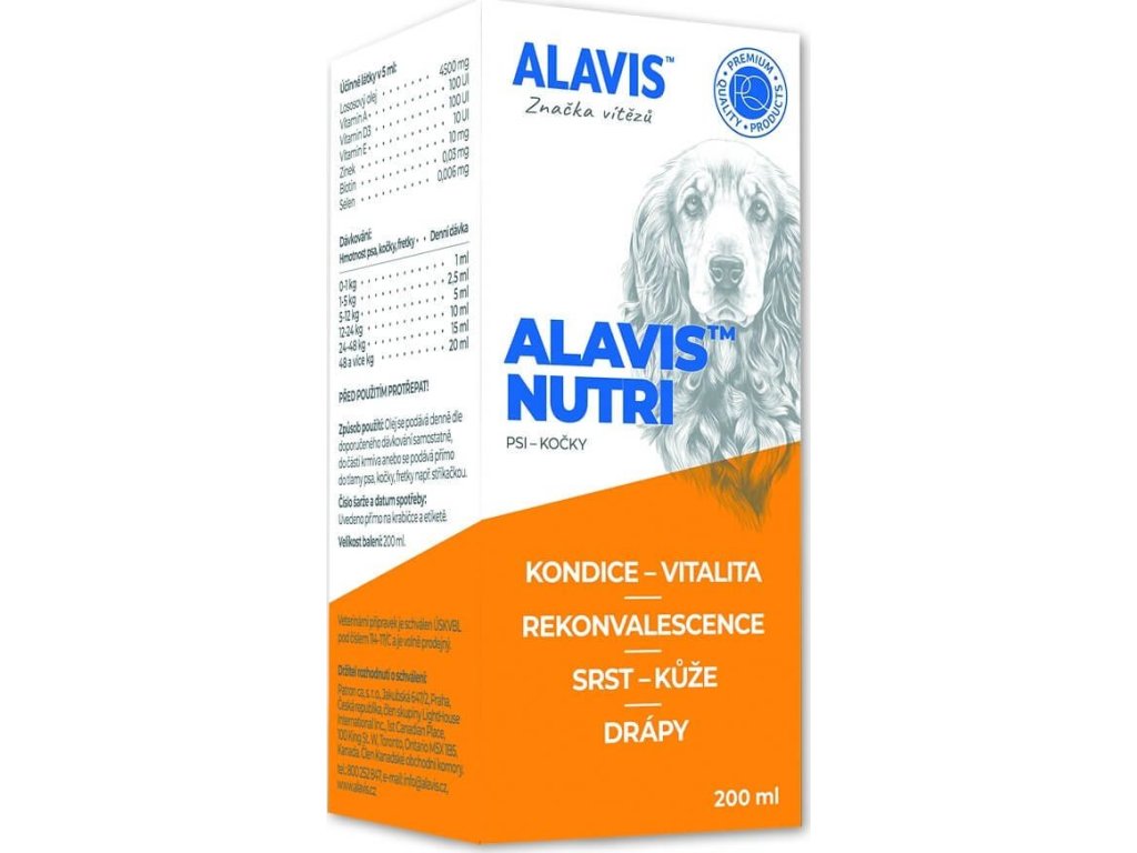 Alavis Nutri je veterinární přípravek obsahující lososový olej, vitaminy (A, D3, E, biotin) a minerální látky (Zn, Se). Olej napomáhá rekonvalescenci, lepší kondici.