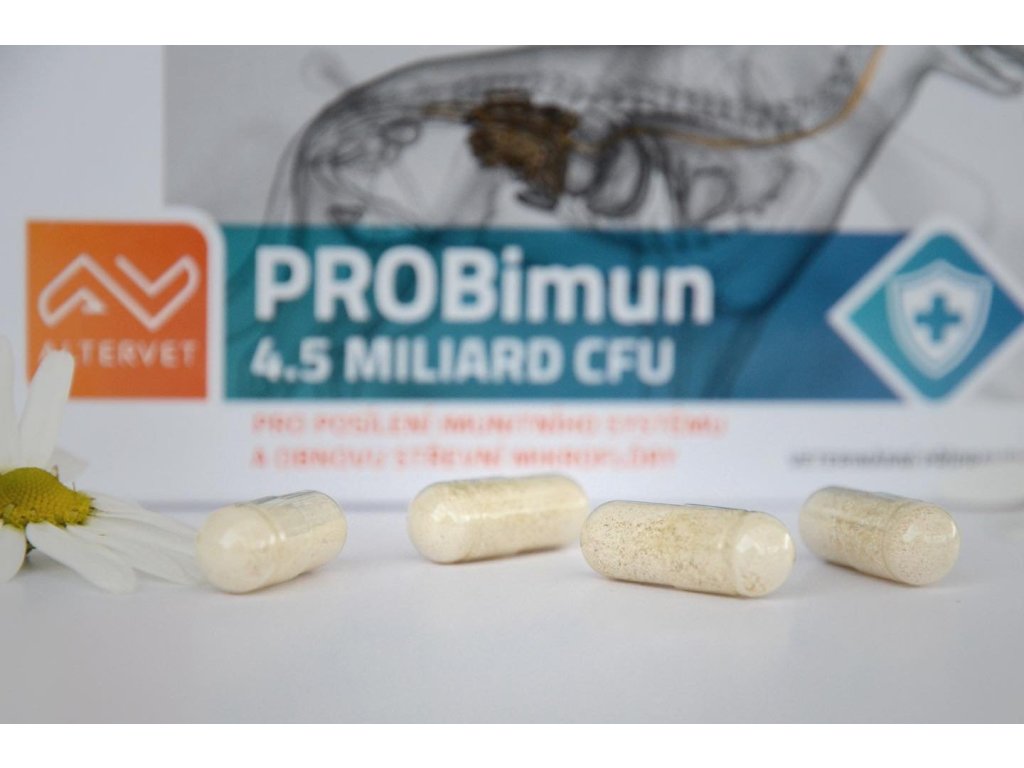 Kapsle, všechna plemena, na imunitu, probiotika a prebiotika, na tráveníAltervet PROBimun je veterinární doplněk stravy určený pro psy a kočky, který obsahuje kombinaci šesti probiotických kultur, betaglukanu a kolostra. Každá kapsle obsahuje 4,5 miliard CFU (Colony Forming Units) živých probiotických bakterií, které pomáhají obnovit, posílit a regenerovat střevní mikroflóru.