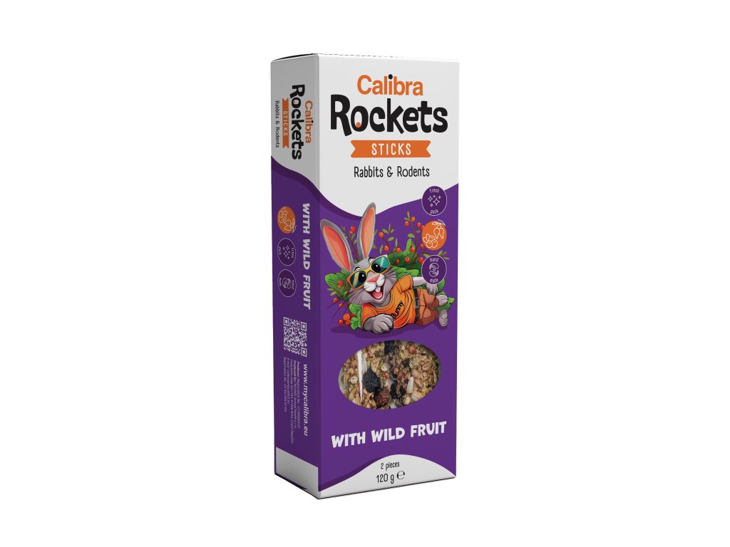 Calibra Rockets Sticks Rabbits & Rodents Wild Fruit jsou pochoutkou určenou pro králíky, morčata, činčily a další hlodavce. Dvě tyčinky s obsahem divokých plodů jsou plné dalších jejich oblíbených ingrediencí. Tyčinky jsou vyráběné ručně a jsou balené v ochranné atmosféře pro maximální zachování čerstvosti. Tyčinky mají závěsný systém, který umožňuje zavěšení na okraj terária nebo mřížku u klece.