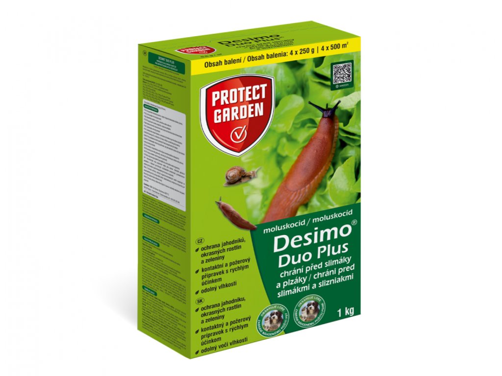 DESIMO DUO PLUS z řady PROTECT GARDEN je vysoce účinný kontaktní a požerový moluskocid proti všem druhům slimáků a plzáků v zahradě. Přípravek ve formě granulované nástrahy k přímému použití k ochraně jahodníku, zeleniny a okrasných rostlin s rychlým účinkem. Pro slimáky je vysoce atraktivní, přijímají jej jako potravu a následně hynou. Je odolný dešti, což je vzhledem k aktivitě slimáků důležitý předpoklad jistoty zásahu.