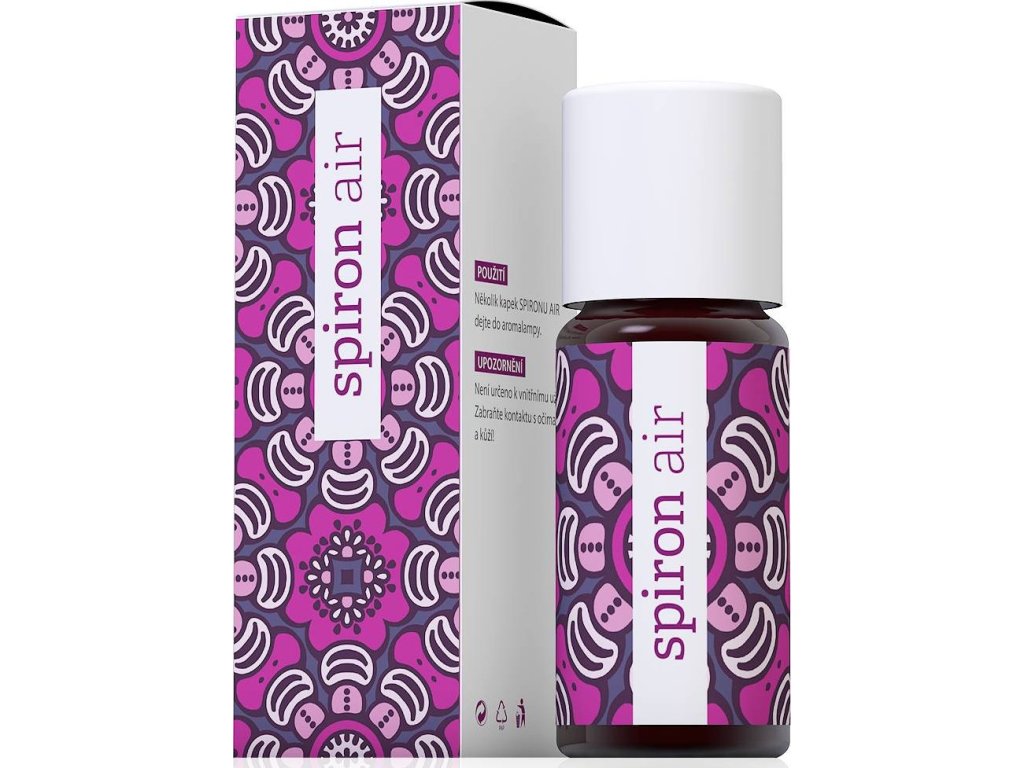 Spiron Air představuje oblíbenou směs nejčistších přírodních éterických olejů, která je určena pro použití do difuzérů a aromalamp. Pozitivně ovlivňuje zejména dráhu plic, srdce, tlustého střeva, žaludku, opasku a další energetické dráhy. Spiron Air najde své využití hlavně při kašli, bolestech hlavy, depresích, neurastenii, nervovém vyčerpání, infekčním onemocnění plic a při chřipkách.