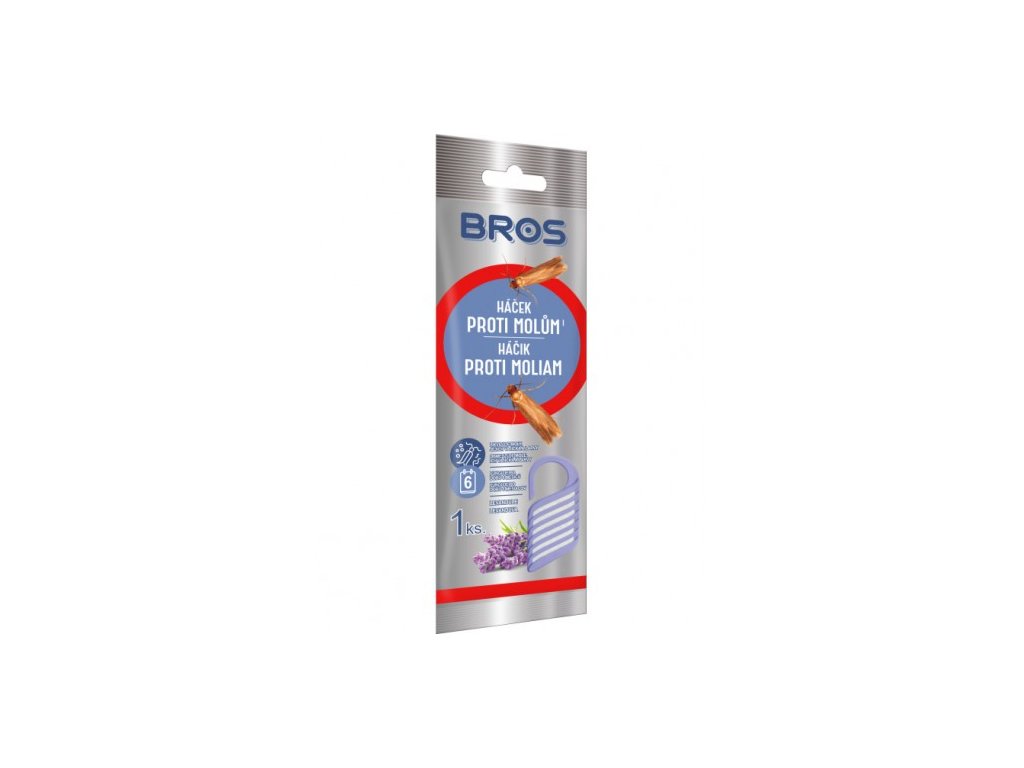 Bros závěsný háček proti šatním molům účinně chrání oděvy, látky a kožichy před poškozením moly. Závěs lze používat v šatnících, skříních, zásuvkách, kufrech apod. Závěs dává navíc oděvům příjemnou levandulovou vůni. Přípravek působí ihned po vyjmutí z obalu, je účinný po dobu 6 měsíců.