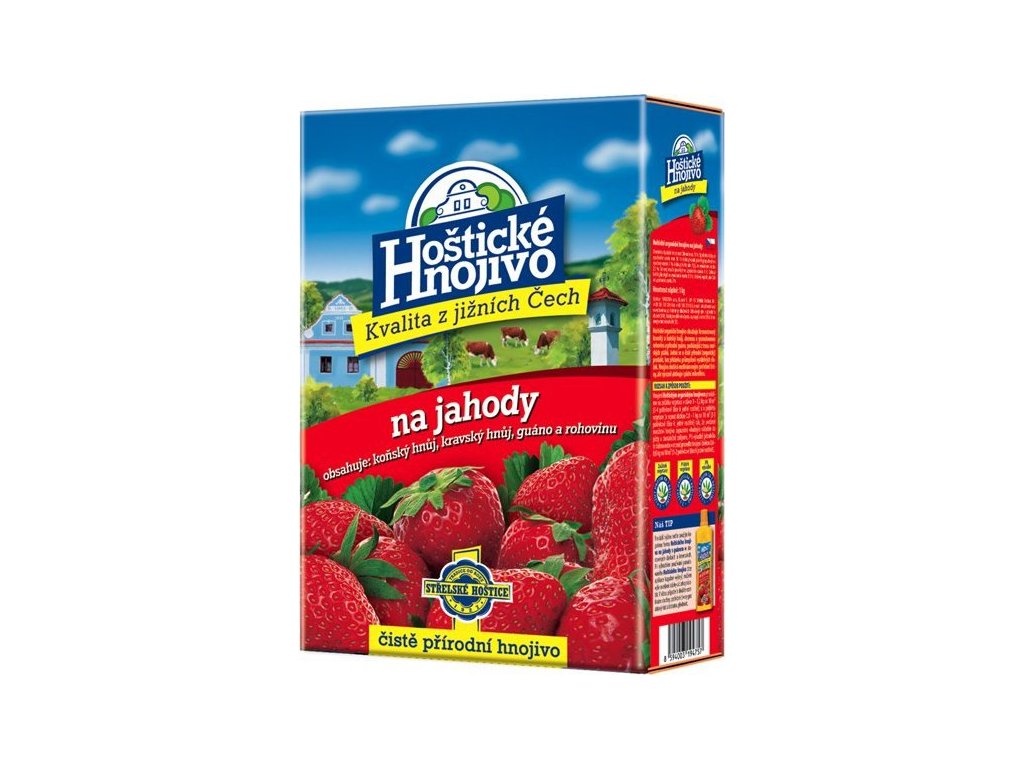 Hoštické organické hnojivo na jahody obsahuje fermentovaný kravský a koňský hnůj, drcenou a granulovanou rohovinu a přírodní guáno, pocházející z trusu mořských ptáků. Jedná se o čistě přírodní produkt, bez přídavku průmyslově vyráběných složek. Hnojivo dodává nejen potřebné živiny, ale výrazně aktivuje i půdní mikroflóru.