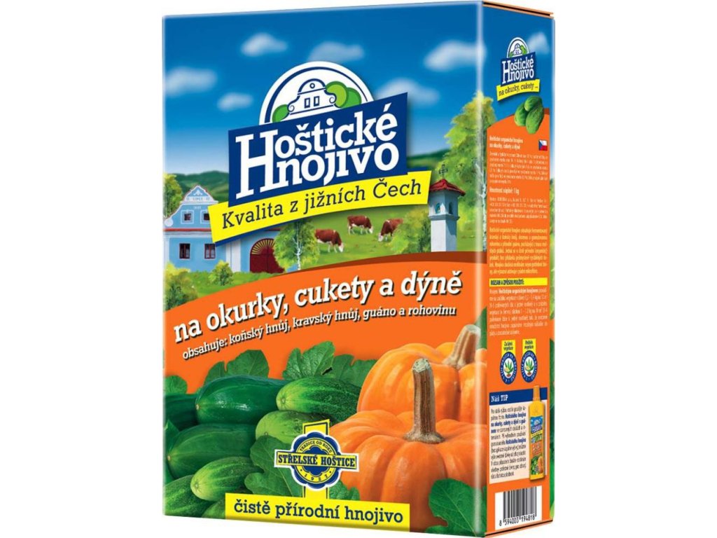 Hoštické organické hnojivo na okurky, cukety a dýně obsahuje fermentovaný kravský a koňský hnůj, drcenou a granulovanou rohovinu a přírodní guáno, pocházející z trusu mořských ptáků. Jedná se o čistě přírodní produkt, bez přídavku průmyslově vyráběných složek. Hnojivo dodává nejen potřebné živiny, ale výrazně aktivuje i půdní mikroflóru.