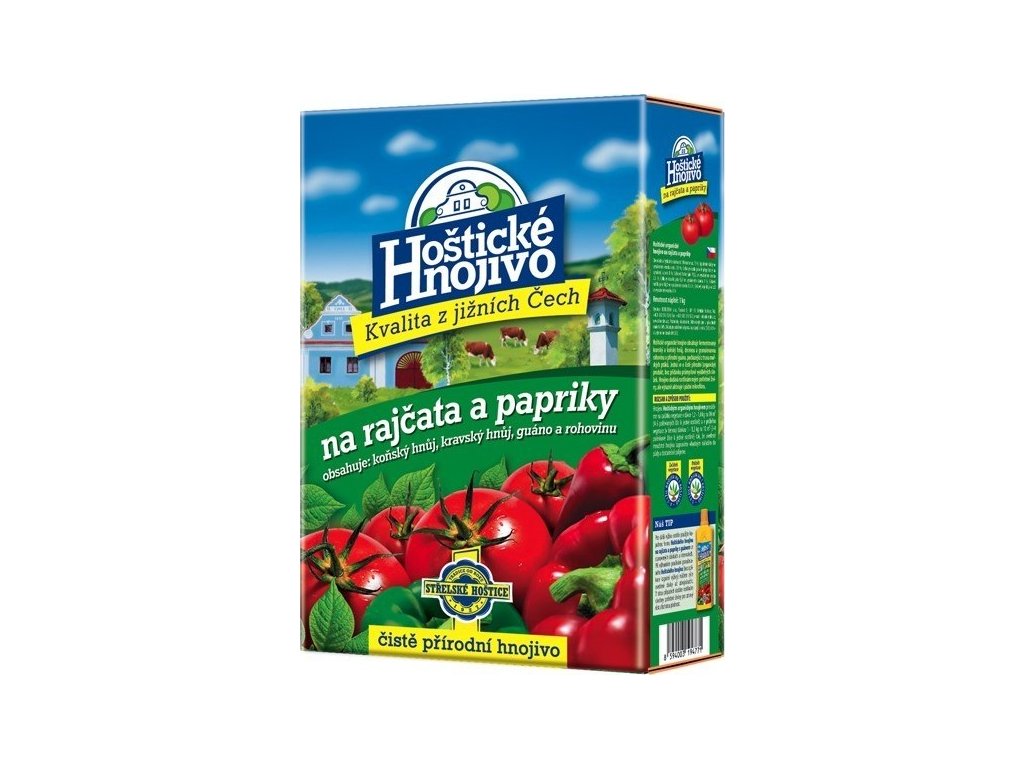 Hoštické organické hnojivo na rajčata a papriky obsahuje fermentovaný kravský a koňský hnůj, drcenou a granulovanou rohovinu a přírodní guáno, pocházející z trusu mořských ptáků. Jedná se o čistě přírodní produkt, bez přídavku průmyslově vyráběných složek. Hnojivo dodává nejen potřebné živiny, ale výrazně aktivuje i půdní mikroflóru.