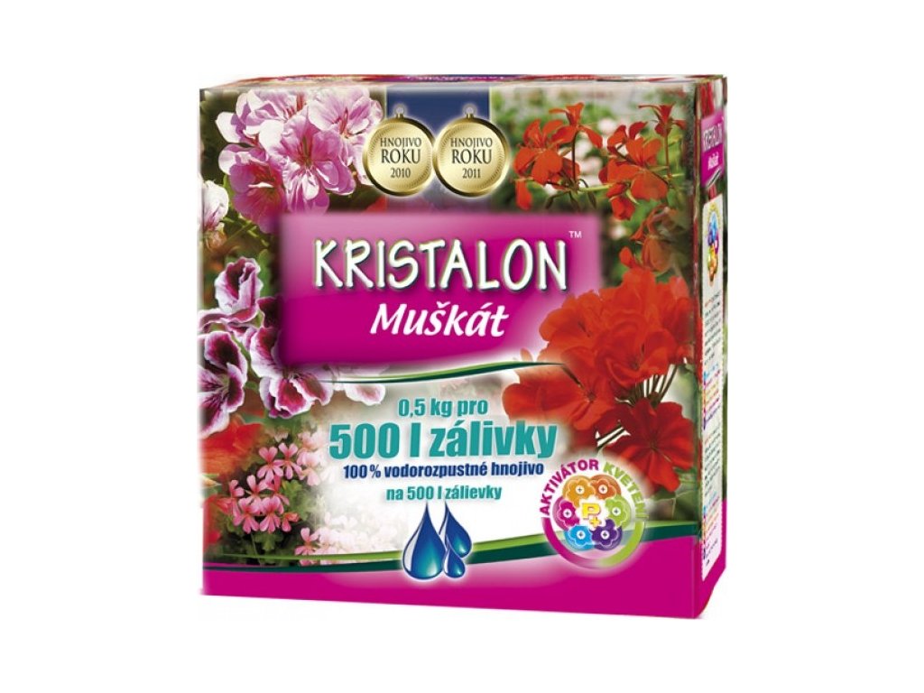 KRISTALON Muškát – hnojivo nové generace je krystalické, vodorozpustné hnojivo s unikátním složením a aktivátorem kvetení. Udržuje rostliny stále v intenzívním růstu, se silnými a dlouhými výhony. Zajišťuje syté barvy květů, bohatá květenství a bujný kořenový systém. Hnojivo je použitelné i pro ostatní balkónové rostliny – surfinie, begonie, fuchsie, lobelky, bakopy, vějířovky, gazánie, kejklířky a další. Zamezuje žloutnutí listů. Aplikace zálivkou i postřikem cca 1x týdně. Dávkování: 1 odměrku (10g) hnojiva rozpusťte v 10 l vody. Balení 0,5kg vystačí pro 500 l zálivky
