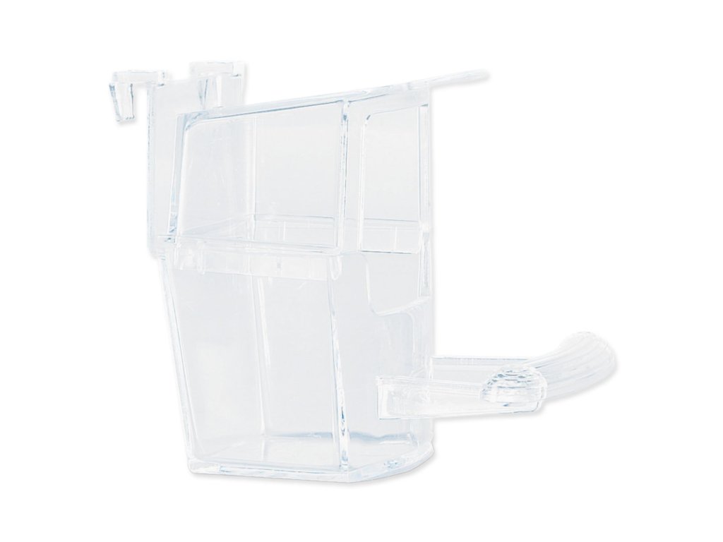 Plastové kryté krmítko s bidýlkem pro okrasné ptactvo.