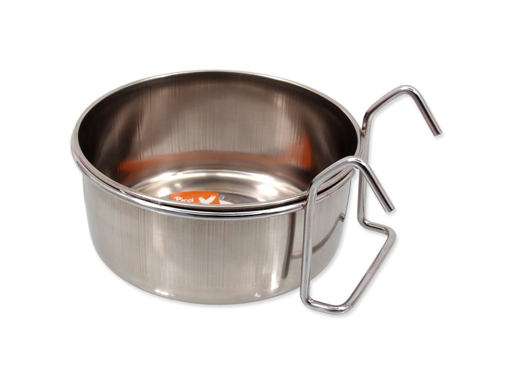 Závěsná nerezová miska do klecí pro ptáky. Průměr: 12,6 cm, výška 5,7 cm, objem 630 ml.