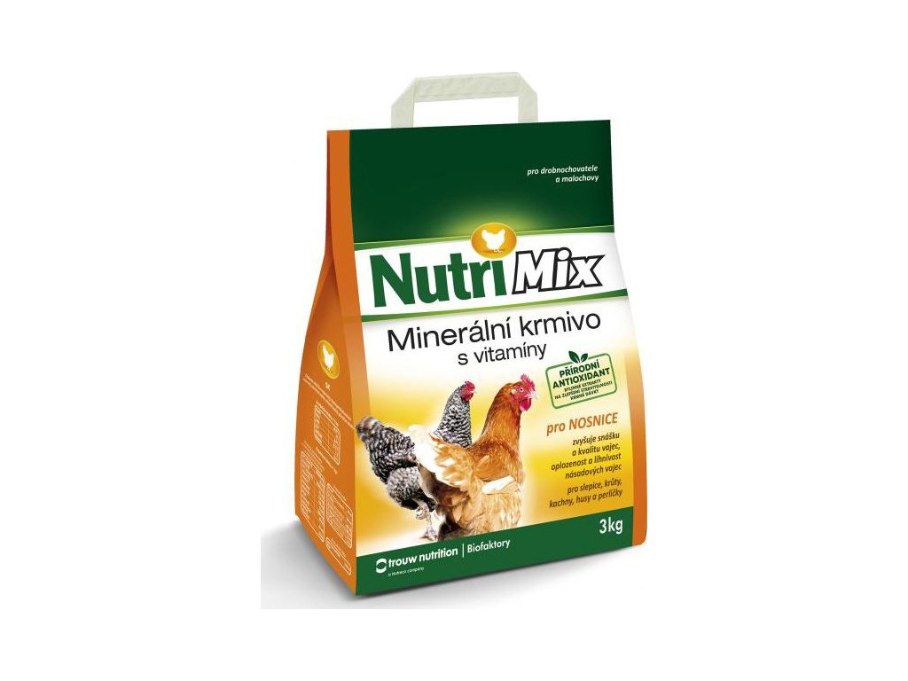 Minerální krmivo s vitaminy pro nosnice. Vitamino-minerální směs NUTRI MIX je určena pro drobnochovatele a malochovy. Přidává se do krmné dávky drůbeže, kterou tvoří převážně obilné šroty, kuchyňské zbytky a další domácí krmiva.