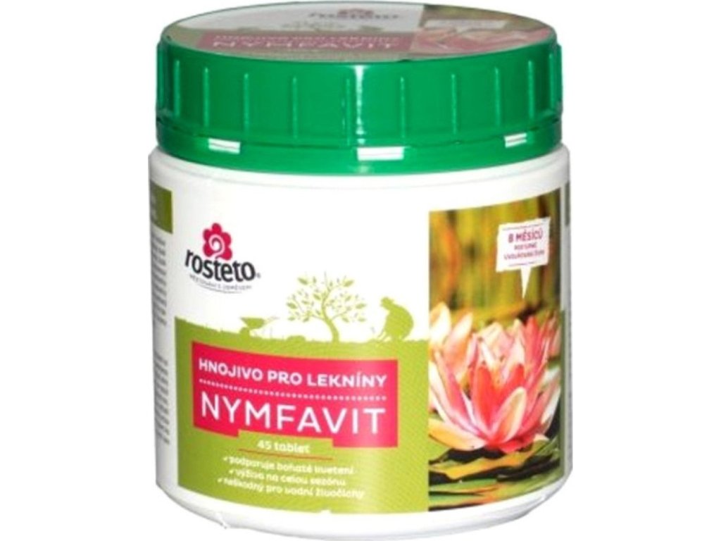 Nymfavit Rosteto je speciální pomalu rozpustné hnojivo v tabletách pro dlouhodobé individuální hnojení a přihnojování leknínů. Hnojivo uvolňuje živiny po dobu až 8mi měsíců. Balení obsahuje cca 45 ks tablet.