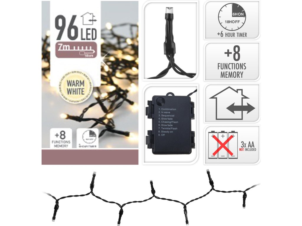Vánoční osvětlení 7 m, 96LED, teplá BÍ, 8 funkcí, ZE, IP44.