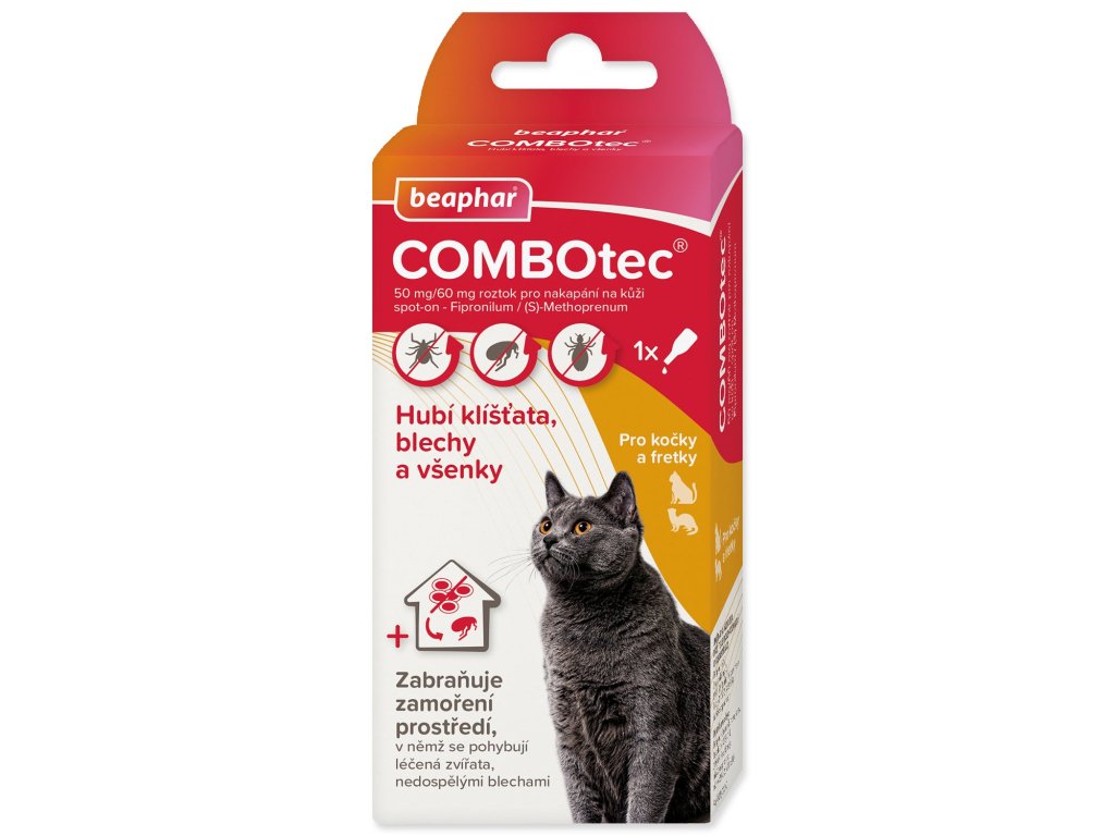 Přípravek Combotec je založený na účinné kombinaci dvou antiparazitik. Chrání kočky a fretky před napadením blechami, klíšťaty a všenkami a zároveň zabraňuje zamoření okolního prostředí blechami.