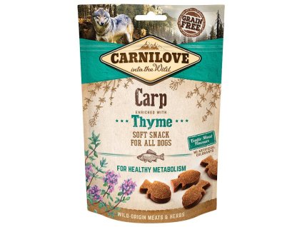 Carnilove poloměkký kapří pamlsek s tymiánem . Pamlsek pro zdravý metabolismus , bez obsahu obilovin a brambor je vhodný pro psy všech plemen.
