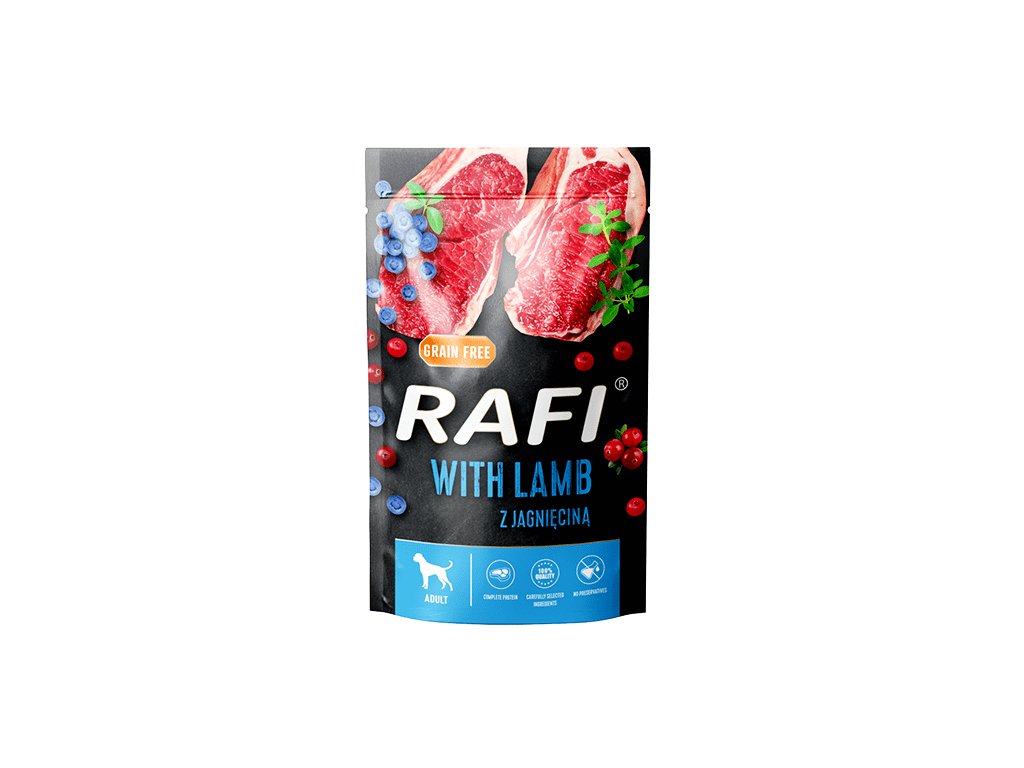 Mokré krmivo Rafi obsahuje správné poměry selenu a mědi. Přidání tymiánu zvyšuje senzorickou přitažlivost tohoto mokrého jídla. Jehněčí maso a suroviny jsou také zdrojem aminokyselin methioninu, isoleucinu a cystinu. Kvalitu krmiva zvyšuje obsah borůvek a brusinek, které jsou zdrojem mnoha cenných vitamínů a živin.