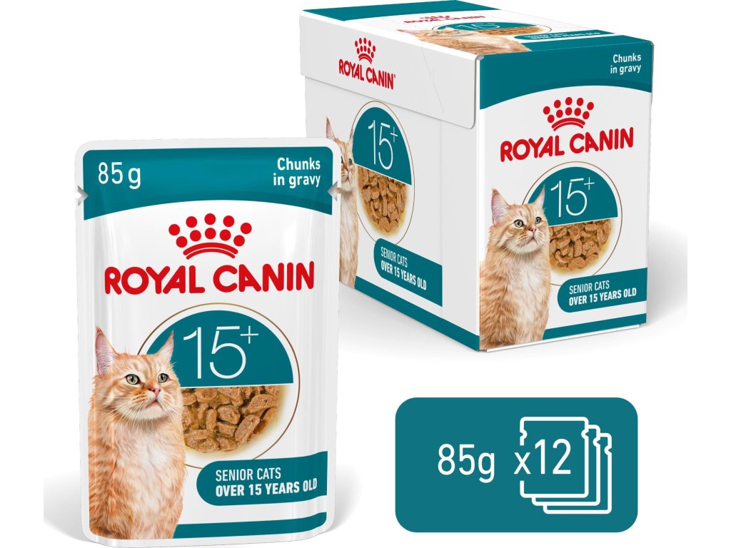Krmivo ROYAL CANIN® Ageing 15+ Chunks in Gravy, navržené pro starší kočky, se vyznačuje snadno stravitelnou texturou, která vaší kočce poskytne příjemný zážitek z jídla. Toto složení také obsahuje zvýšené chutné látky pro vylepšenou chuť a čich. Složení s naším HealthyAge7™ Advanced Complex poskytuje přesnou nutriční směs navrženou tak, aby pomohla udržet sedm klíčových aspektů zdraví a vitality u koček starších 15 let.