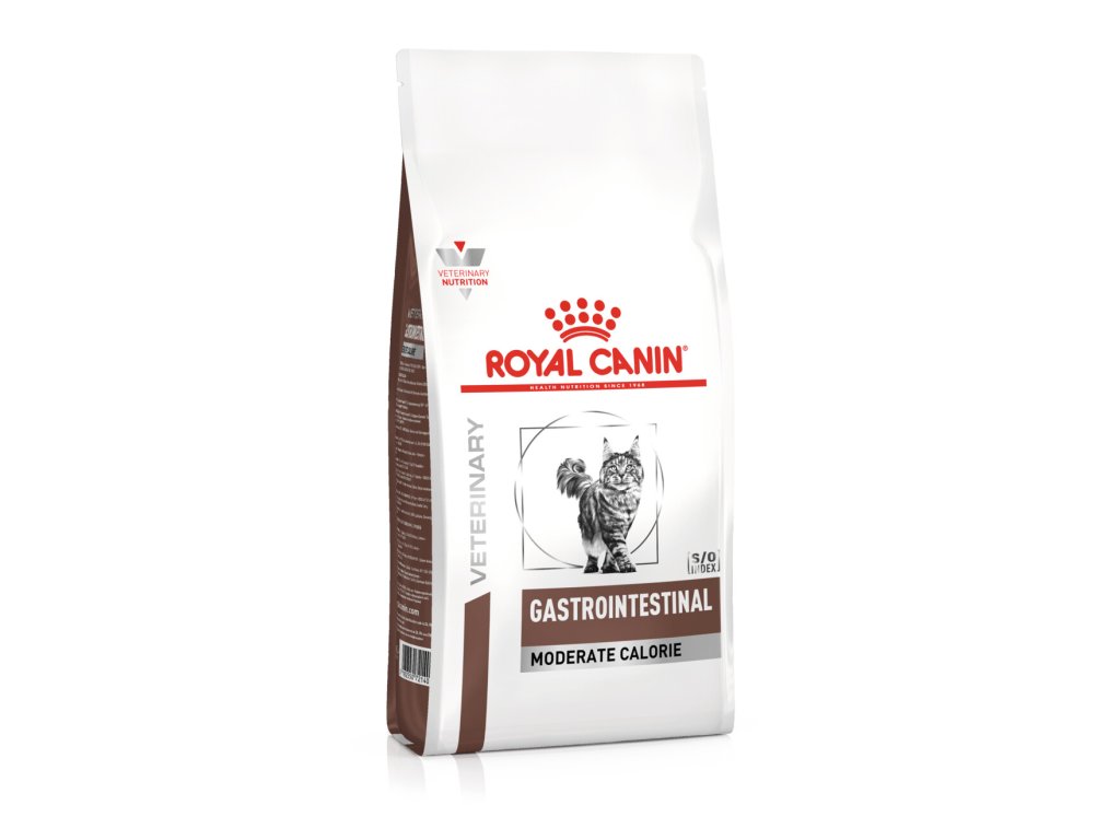 Royal Canin Veterinary Diet Feline Gastro Intestinal Moderate Calorie je kompletním dietním krmivem pro kočky s poruchami trávicího traktu, které snižuje riziko akutních střevních resorpčních onemocnění. Vysoce stravitelné složení.