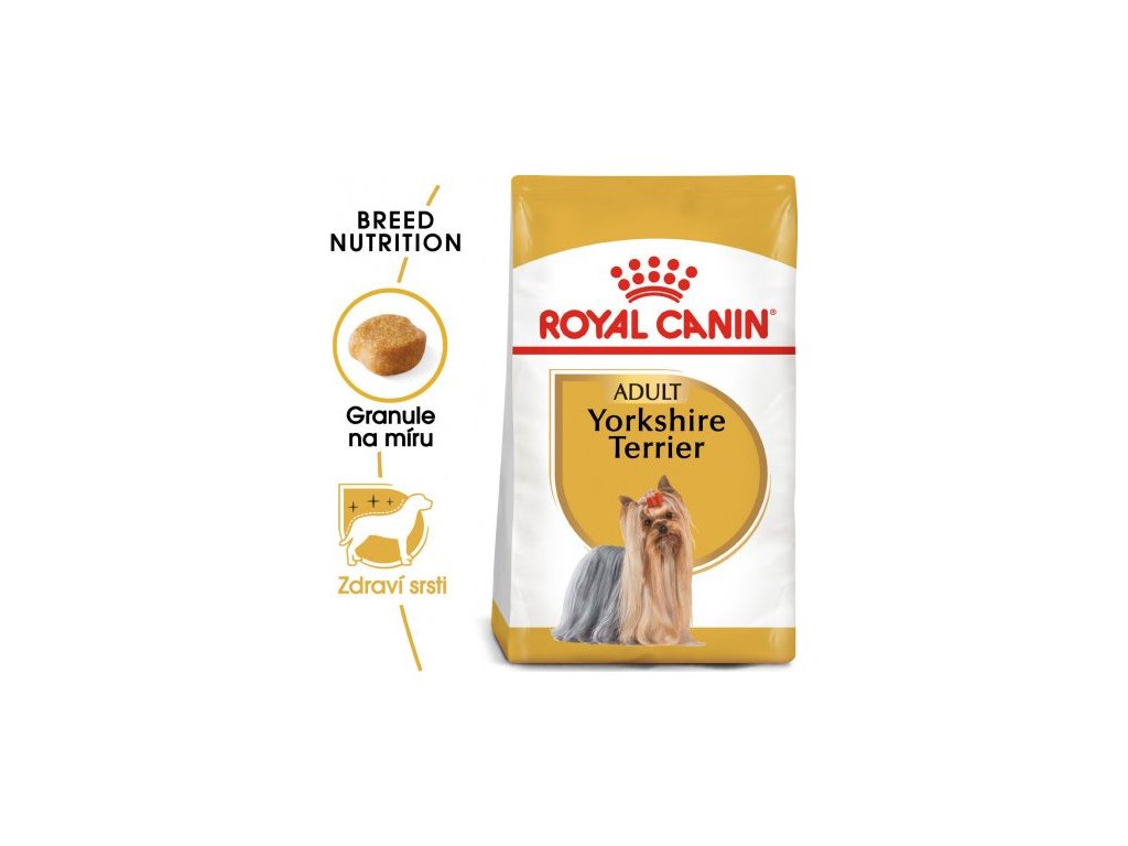 Royal Canin Yorkshire Terrier Adult je kompletní superprémiové krmivo pro dospělé čistokrevné plemeno Jorkširského teriéra od 10 měsíců věku. Granule obsahují prvotřídní maso, omega-3 a 6 mastné kyseliny, brutnákový olej a biotin.