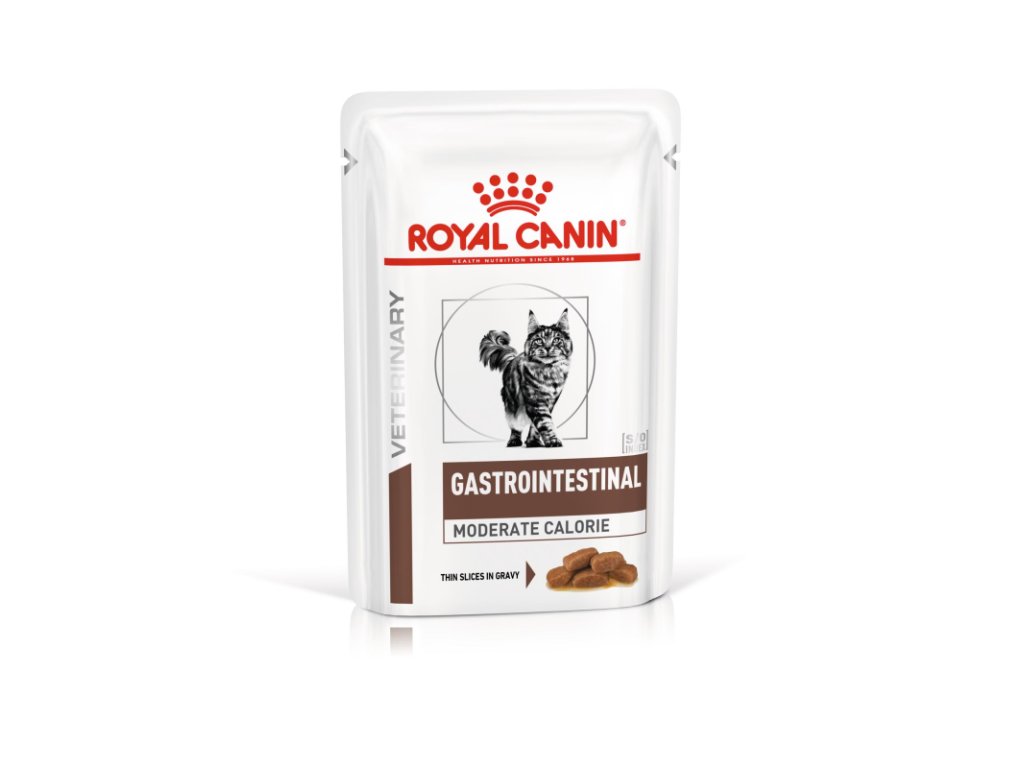 ROYAL CANIN® Gastrointestinal Moderate Calorietenké kousky ve šťávě je kompletní dietní krmivo pro kočky formulované k redukci akutních zažívacích absorpčních onemocnění a jako kompenzace maldigesce.. Vysoce stravitelné suroviny, zvýšený obsah elektorlytů. Nízký obsah tuku. Doporučujeme: před použitím konzultujte veterináře. Krmte Gastrointestinal Moderate Calorie 1 až 2 týdny během období akutního průjmu a během zotavení. Při maldigesci krmte 3 až 12 týdnů a doživotně při chornické pancreatické nedostatečnosti.