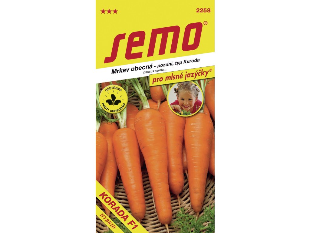 polopozdní odrůda mrkve, která zatím u nás patří k méně známým mrkvím typu Kuroda. Typický je pro ně nejen široký klínovitý, sytě zbarvený kořen, ale především výtečná chuť a šťavnatost. Tupě zakončený kořen má povrch téměř hladký, na řezu je tmavooranžový i v korové části a má vysoký obsah karotenu. Naše KORADA F1 je oproti jiným mrkvím tohoto typu odolnější k praskání i vykvétání a je možné ji vysévat už od konce května. Mezi její přednosti patří dobrý zdravotní stav, především odolnost k padlí a alternáriu. Je vhodná na přímý konzum i výrobu džusů a je také krátkodobě skladovatelná.