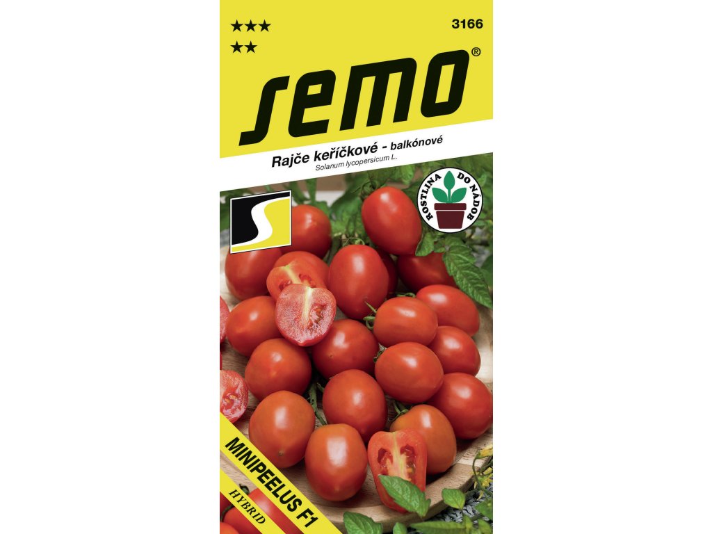 MINIPEELUS F1SM (kód 3166) – kolekce do nádob – rané kompaktní keříčkové rajče s drobnými červenými oválnými plody (15–20 gramů). Vhodné i do menších nádob. Výška rostliny je 20–30 cm v závislosti na velikosti nádoby.