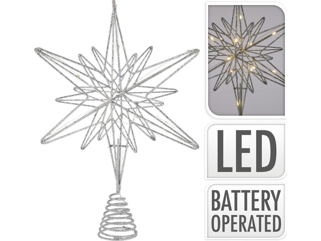 Motiv vánoční dekorace hvězda, počet kusů v balení 1Špička na stromek 20 LED HVĚZDA 33 cm STŘ tvar: hvězda rozměry: 33 cm barva: stříbrná Hvězda je ideální pro zdobení vánočního stromku v našich domovech. Ve tmě vypadá krásně a dodává prostorům atmosféru.