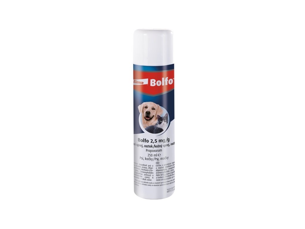 Bolfo sprej vhodný pro psy i kočky určený k hubení parazitů.
