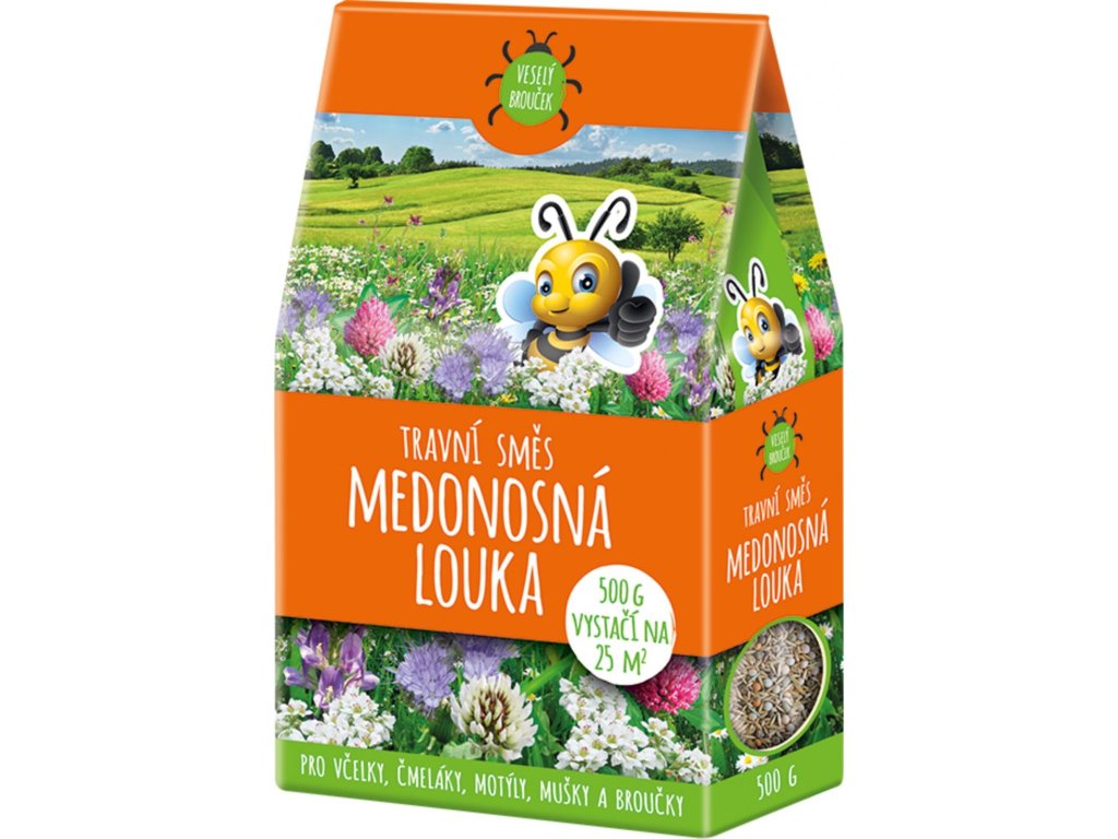 Travní směs – Medonosná louka je druhově velmi pestré osivo. Obsahuje podíl různých druhů trav, jetelovin a ostatních dvouděložných bylin, které jsou bohatým zdrojem nektaru pro opylující druhy hmyzu. Osévání je třeba provádět na místech s předpokládaným výskytem včel a dalších opylovačů (klidný kout zahrady, sadu či parku).