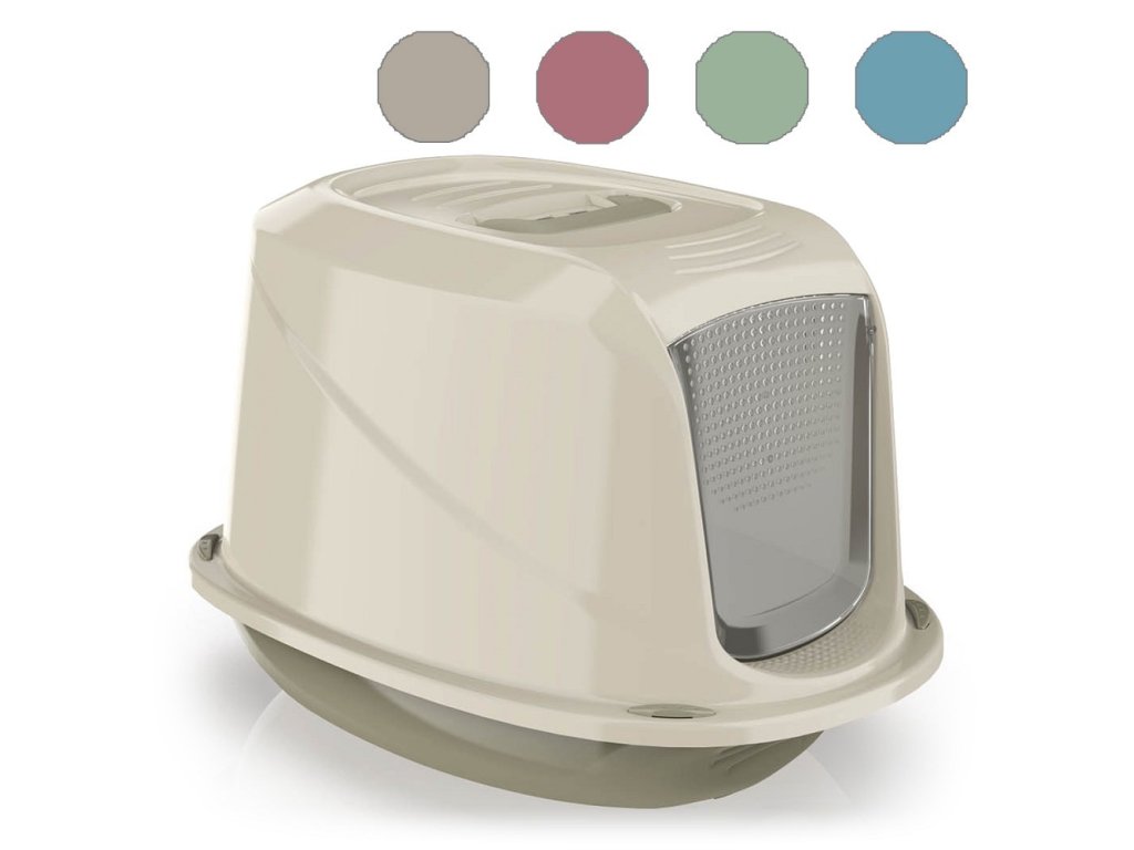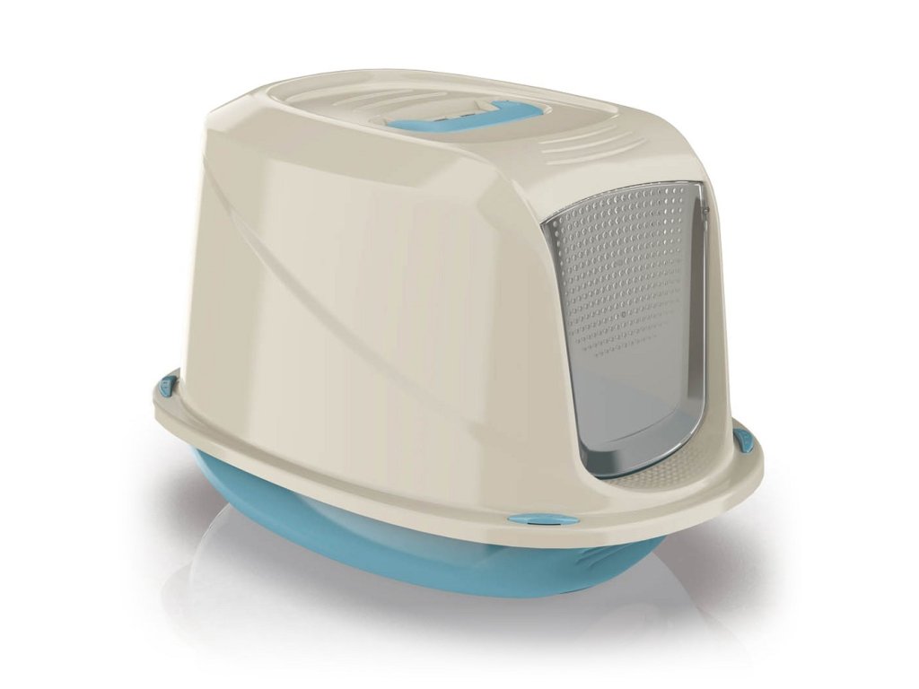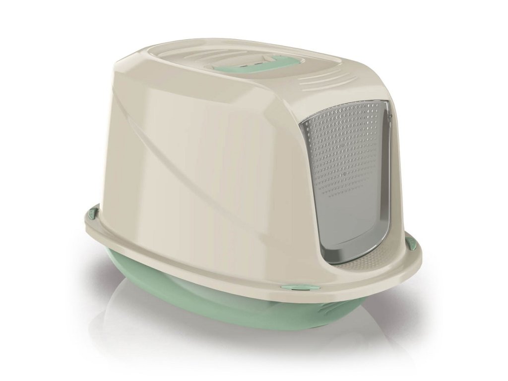 Krytá toaleta pro kočky s filtrem a madlem pro přenos.